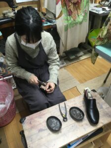 市販靴は機械で釣り込まれますが、当教室では手作業で釣り込む技術を学びます。