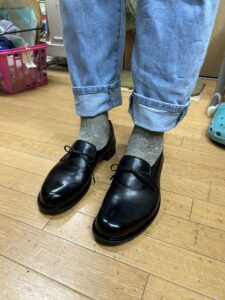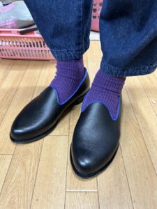 木型補正、釣り込みが望ましくできたことから、スリップオンの靴の履き口が足に寄り添っています。