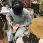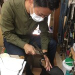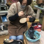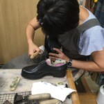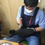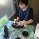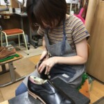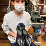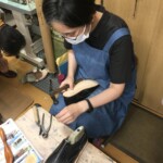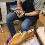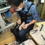 (手釣り底付けとは、革を木型へ引き付ける手での釣り込み作業、靴底取り付け作業。一級技能士)