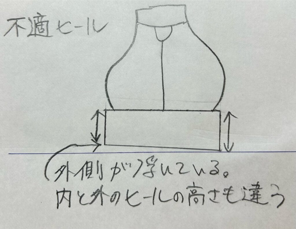 ヒールが傾いていたり、左足の内側外側で高さが違ったり、左右の高さに差が生じていたりするのです。