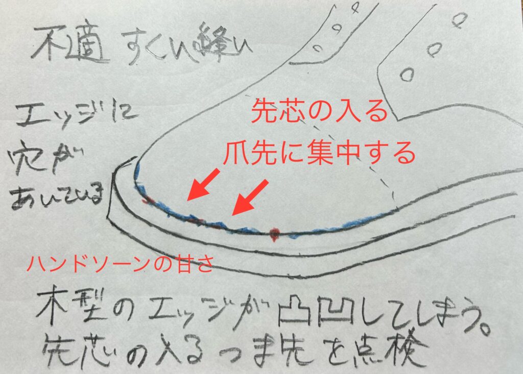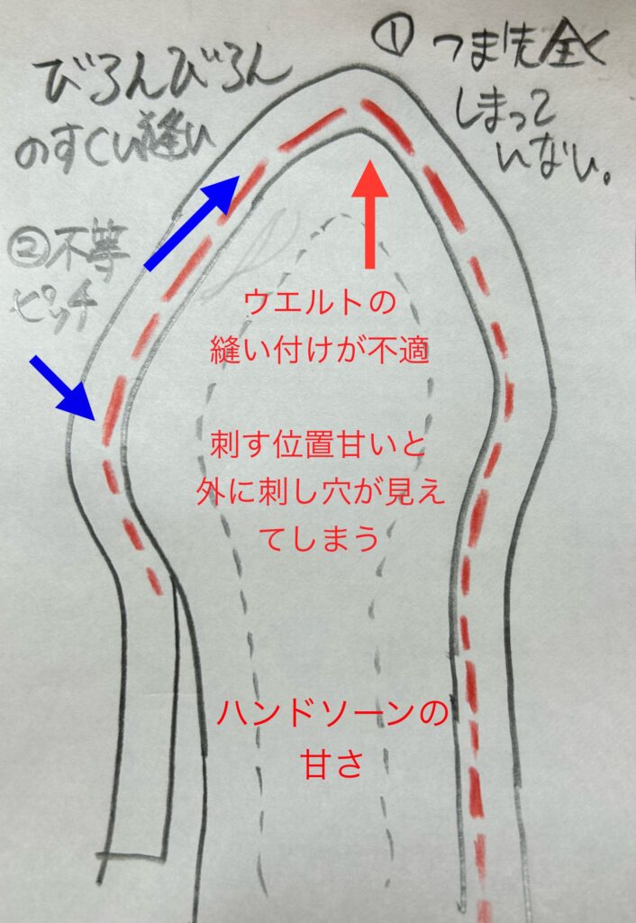 - すくい縫い糸が外に出ている (つま先の先芯が入っている箇所を点検)