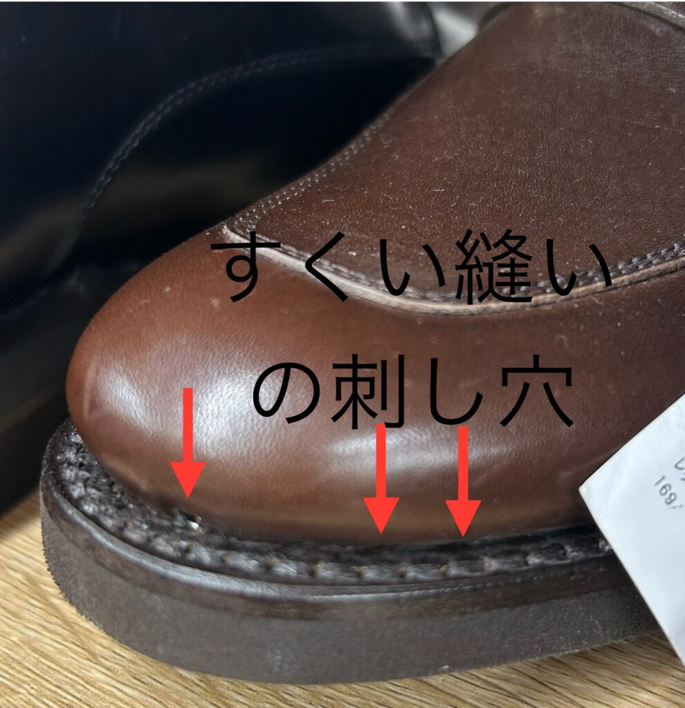 「ハンドソーンウエルテッド製法」という謳い文句により、「この難しいと言われる製法ができる人の靴ならば、きちんと精度がでている靴」と認知バイアスがかかってしまいますが、手製靴だからこそ簡単に不揃いがおきるということを点検してみてください。
